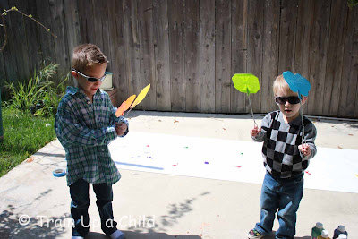 Love this! There have got be artists that actually do this or maybe your kids have invented a new way of painting! Jackson Pollock did "Action Painting" by moving around the canvas on the floor and splattering paint, but this is truly action painting.